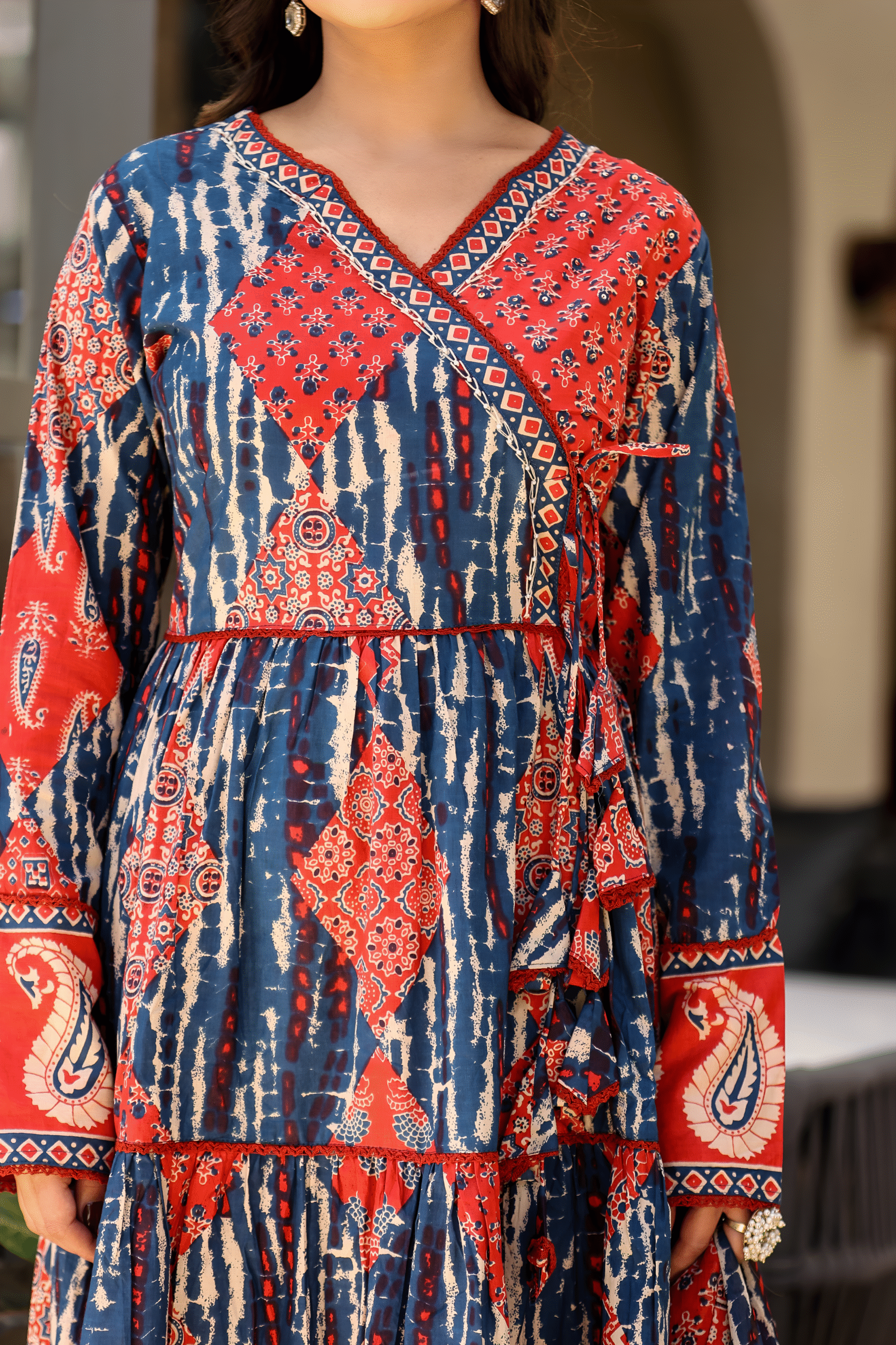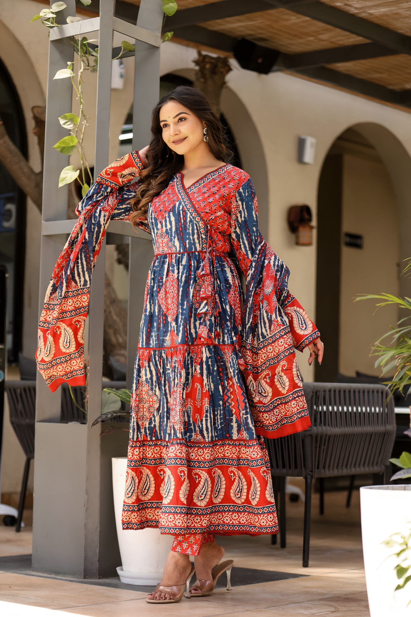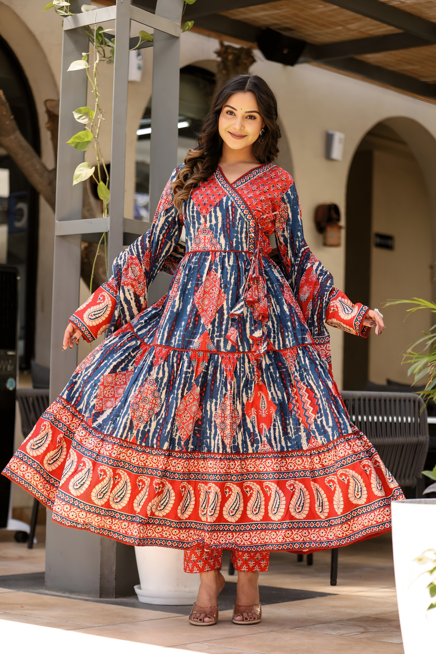 - Pattern: Angrakha Style with Kalidar Flair