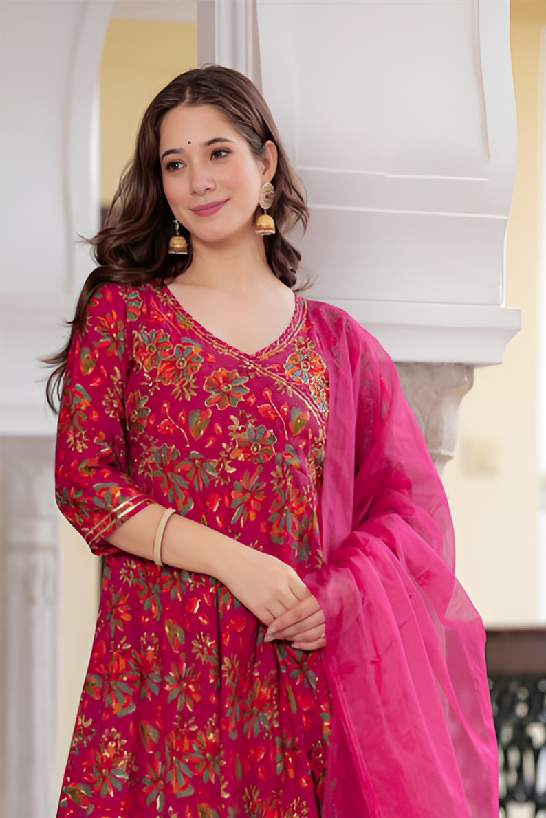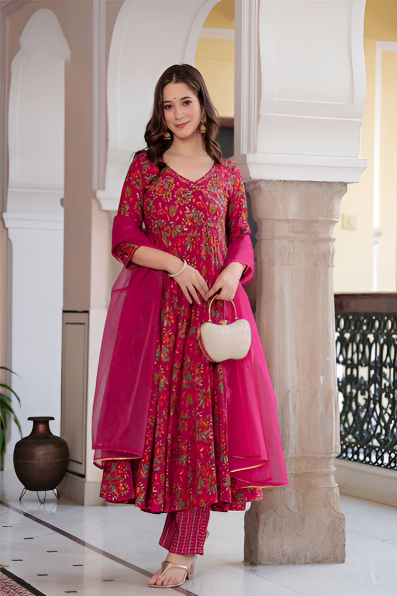 Ready to Wear Flared Dupatta Suit, a perfect blend of comfort and charm. Crafted with premium Muslin fabric for the kurti and pant, and paired with a stunning Matt Organza Dupatta, this set exudes sophistication. The rich Dark Pink hue, intricate Handwork, and delicate Lace Detailing make it a standout choice for festive occasions and family gatherings.